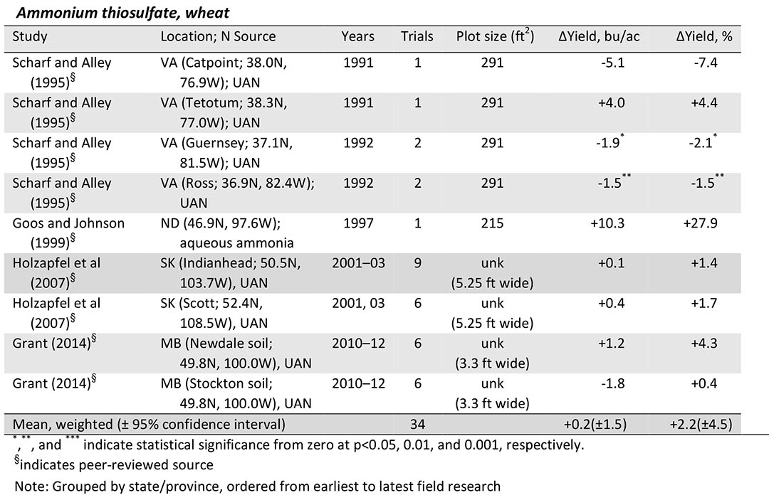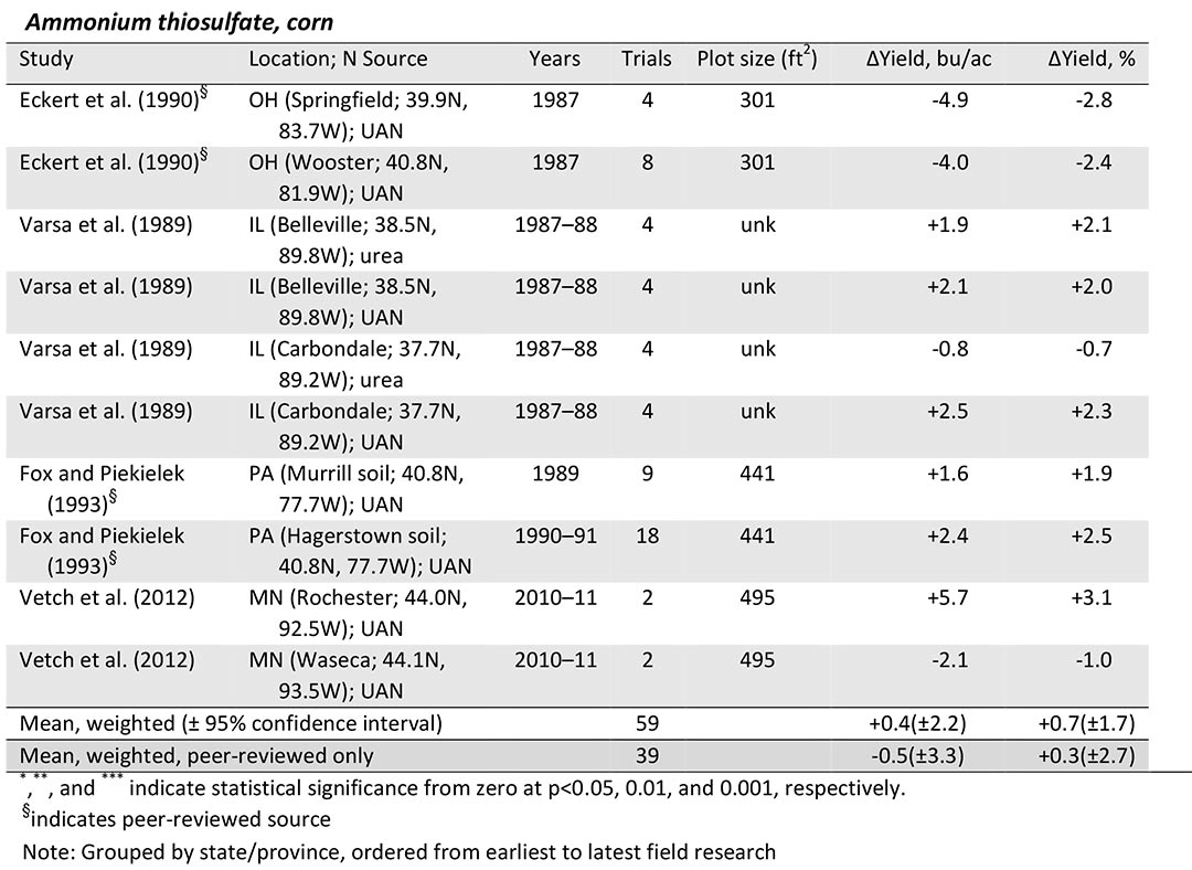 The following tables and discussion summarize the yield impacts of ammonium thiosulfate. Weighted averages are calculated where possible, with results from each study weighted by the inverse of the number of trials in each location. This prevents studies from very well-studied locations from overwhelming the average results.