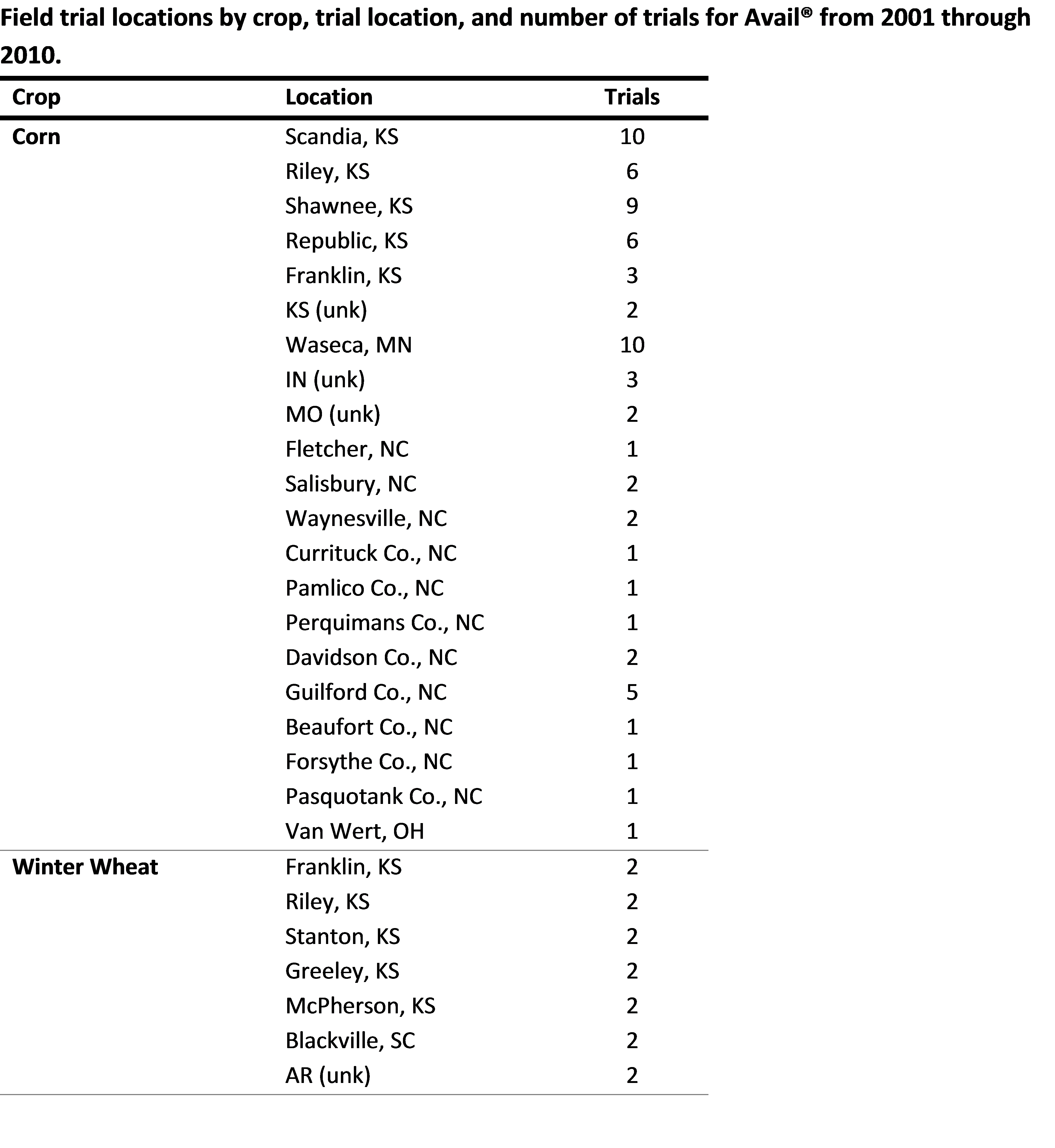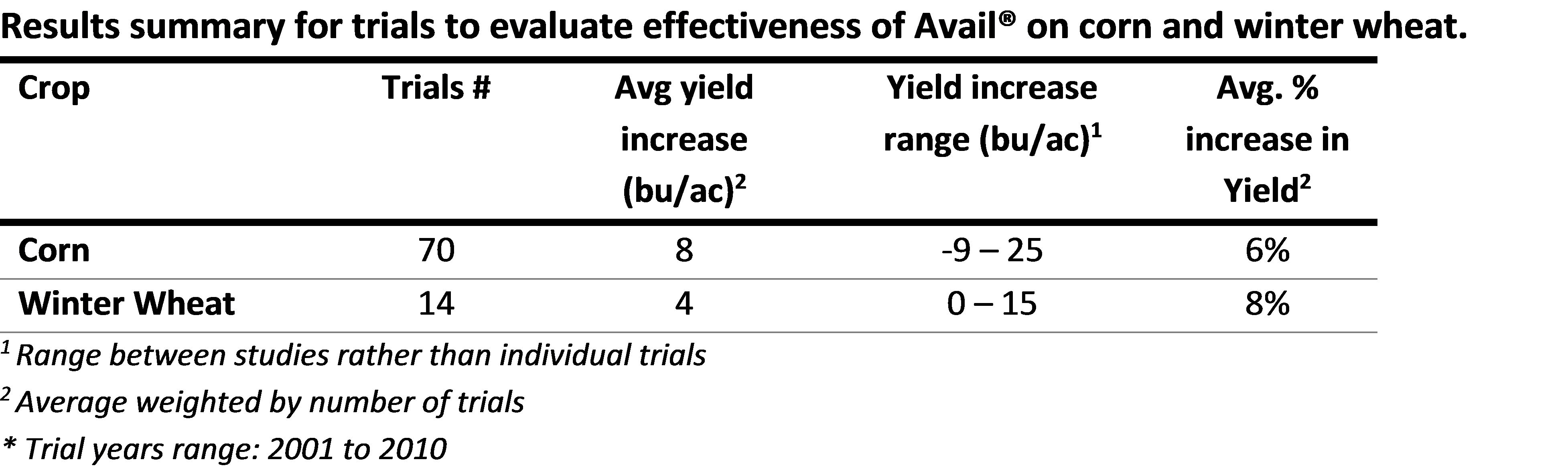 In the available studies, Avail® produced an average wheat yield gain of nearly 8%, and an average corn grain yield increase of almost 6%. These yield benefits may be associated with increased efficiency in terms of various inputs, but overall environmental impacts are uncertain. None of the available studies on this product reported any measurement of nutrient losses.