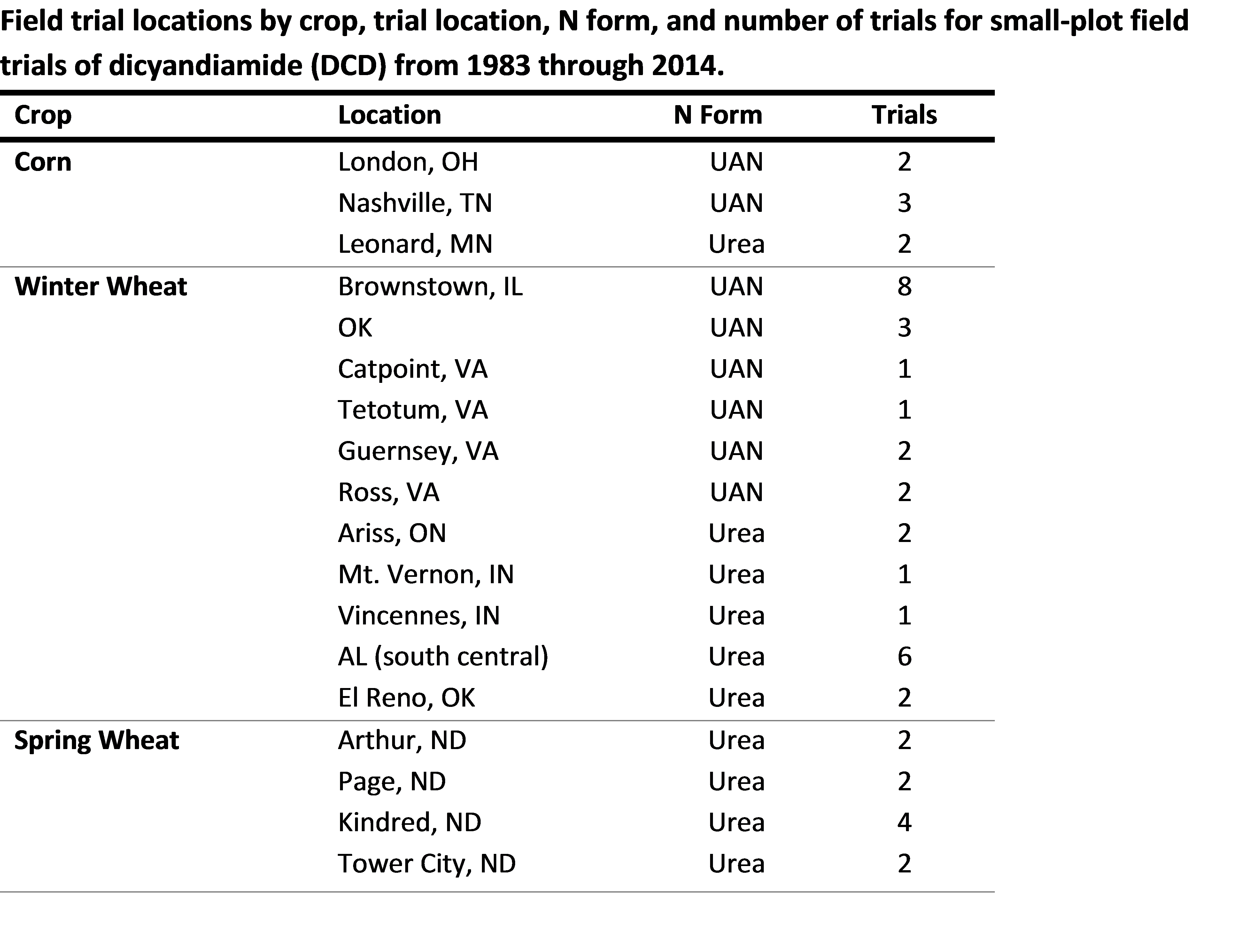 With the data available, and in the conditions studied, DCD did not have any beneficial yield impacts for either wheat or corn. Some of the studies reporting yield decline may not have fully considered the potential for phytotoxicity with certain application methods. In addition, there are soil and climatic conditions under which DCD is expected to be more beneficial than others. Therefore, if DCD is to be recommended as a product for improving N use efficiency, more research (or increased accessibility of existing field data) is needed to determine the climate and soil characteristics or other management practices most likely to see such benefits.